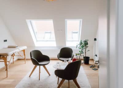 Rustikaler Charme trifft moderne Gestaltung: alte Holzbalken, viel natürliches Licht, warme Materialien und eine ruhige Umgebung, in der Menschen sich öffnen und fokussiert arbeiten können.